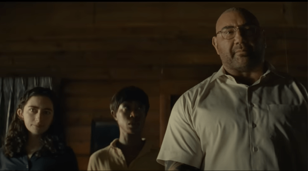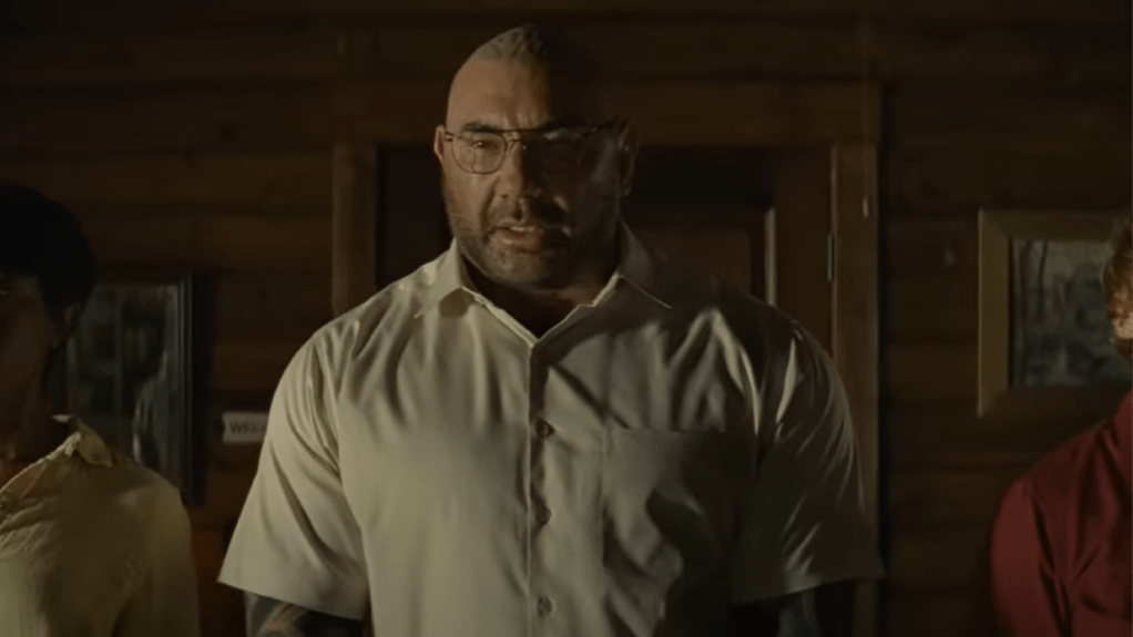 The trailer starts off fun and carefree; we two dads with their daughter cheerfully singing together on their road trip to their cabin destination. Afterwards, we see the family relaxing and enjoying the outdoors, until a stranger (Bautista) introduces himself to the little girl.