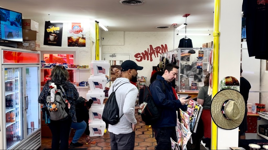 The Motel’s lobby was transformed into a gas station and mini-mart, similar to the ones Dre frequented in the series. Guests were also gifted bloody dollars that could be used to purchase snacks and beverages. Additionally, guests received “lottery tickets” for a chance to win either a screen-printed Swarm t-shirt or a embroidered bucket hat. You also had the choice to take home a Swarm souvenir cup.