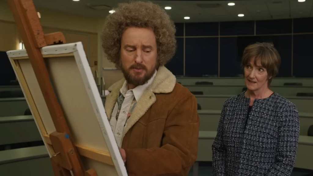 Heavily inspired by PBS star Bob Ross, the film follows Carl Nagle (Owen Wilson). Carl sports permed hair and his signature pipe, whispering to audiences across the local community instructing them on how to paint landscapes. Confident and stuck in the glory of his past, Carl is totally comfortable in this situation.