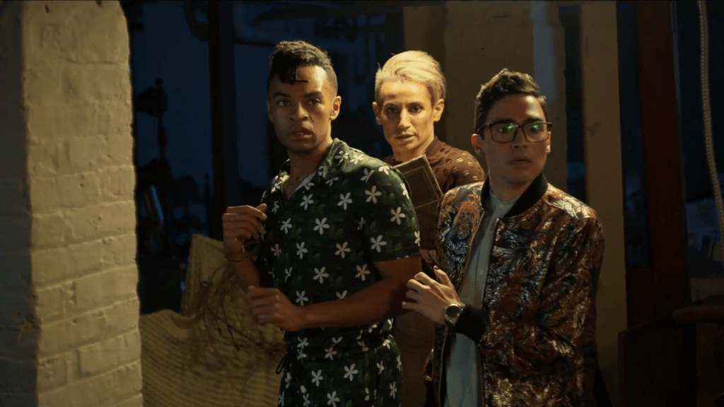 The film stars Travis Coles, Frankie Grande, Troy Iwata, Noah J Ricketts, and Nicholas Logan. I thought the cast was great and the standout for me was Frankie Grande. Although the film does for the most part stick to the comedy it does have some tense and spooky moments. All of the actors really committed to each of these moments and truly delivered especially when it came to the comedy. I will say it wasn’t as scary as I was expecting but I’m happy with the final result. Summoning Sylvia actually has the right amount of scariness, campiness, and goofiness I wanted. The movie is quick when it comes to the jokes as it never has a dull moment in its run time. The writing and directing here is sharp and witty as we see the story interweave comedic moments with deeper underlying themes.