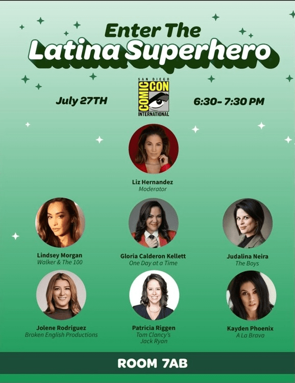 The Latina Superheroes Behind the Scenes will be on July 27 at 6:30pm, moderated by Liz Hernandez. The panel features the following executives and talent as part of the Hollywood Latino community:
