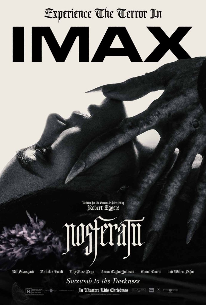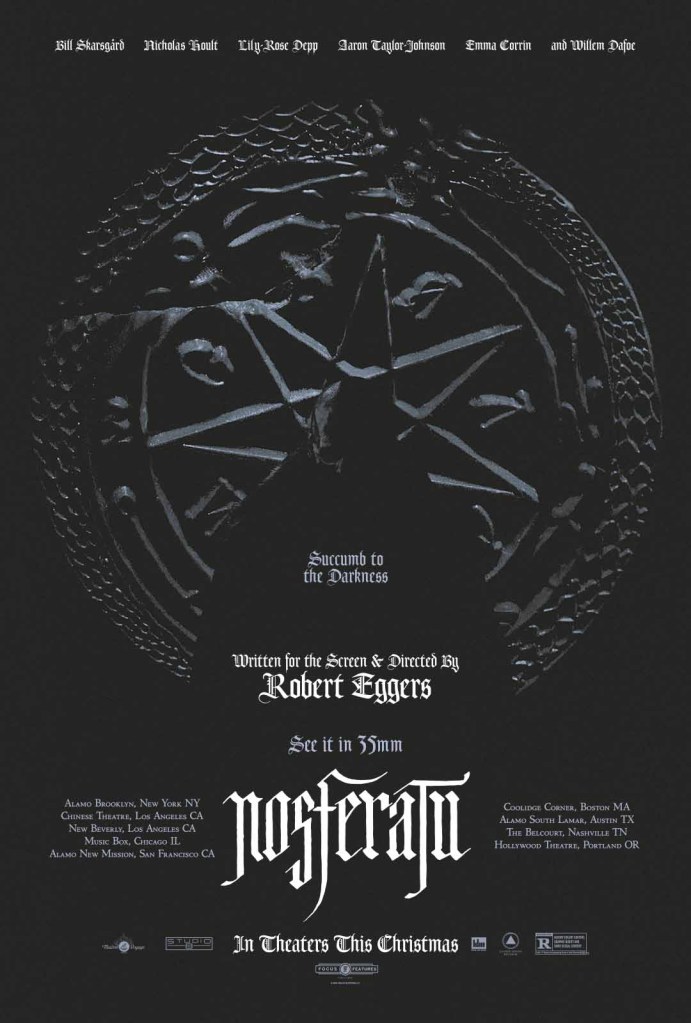 Written and directed by Robert Eggers. Bill Skarsgård plays the titular character. Lily-Rose Depp (The Idol) plays Ellen Hutter and Nicholas Hoult (Renfield) portrays her husband, Thomas. Aaron Taylor-Johnson (Kraven: The Hunter) and Emma Corrin (The Crown) play another couple, Friedrich and Anna Harding. The cast also includes Ralph Ineson (The Witch, The Northman), who plays Dr. Wilhelm Sievers, Simon McBurney plays Herr Knock and Willem Dafoe plays Professor Albin Eberhart Von Franz.